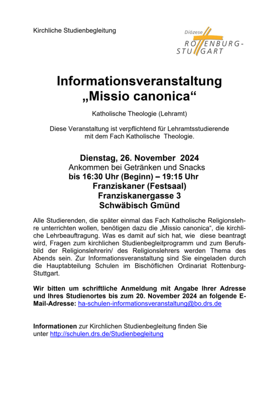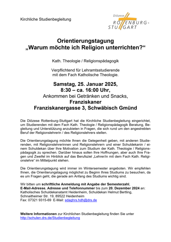 Informationen erhalten Sie unter anderem im Rahmen der (verbindlichen) kirchlichen Studienbegleitung - aber auch z.B. über die oben gesetzten Links, unter denen Sie bei Bedarf auch Ansprechpartner finden.