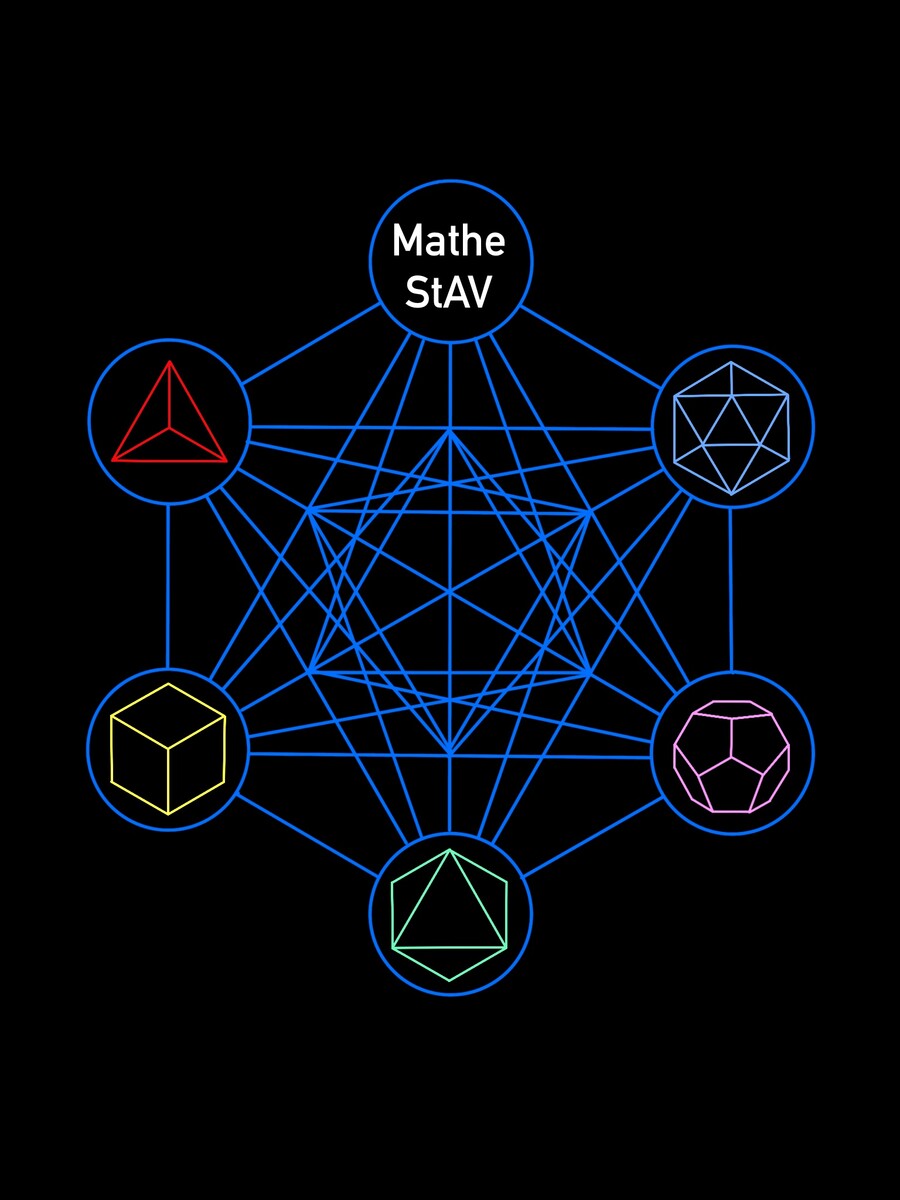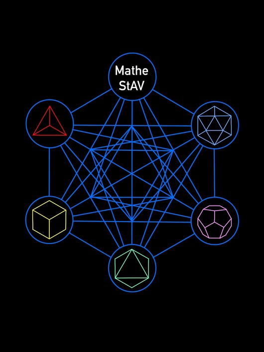 Das Logo der StAV Mathe ist eine Abwandlung des Metatron Würfels. Dieser entsteht, indem die Schrägbilder der fünf platonischen Körper übereinandergelegt werden. Platonische Körper sind Polyeder, deren Oberfläche aus identischen Vielecken besteht. In den äußeren Kreisen sind die platonischen Körper dargestellt, welche in dem Würfel des Metatron wiederzufinden sind. Diese sind der Tetraeder, der Oktaeder, der Hexaeder (bzw. Würfel), der Ikosaeder und der Dodekaeder. Der Würfel des Metatron kann außerdem über die „Blume des Lebens“ konstruiert werden. Dazu werden die Kreismittelpunkte des Symbols miteinander verbunden. In der Heiligen Geometrie wird dem Würfel des Metatron eine große Bedeutung zugesprochen. Er symbolisiert die Bausteine des Universums, welche nach geometrischen Mustern strukturiert sind. Die Mathematik ist in jedem dieser Bereiche wiederzufinden. Jedem platonischen Körper wird ein Element – Feuer, Luft, Erde, Äther, Wasser – zugeordnet. Die Zuordnung zu den Elementen spiegelt sich in der Farbwahl des jeweiligen Körpers im Logo wider. Genauso wie die Elemente in der Welt vorkommen, ist auch die StAV Mathe in vielen Bereichen im Mathematikstudium vertreten. Aus diesem Grund haben wir den Würfel des Metatron als unser Logo gewählt. In der Heiligen Geometrie wird dem Würfel des Metatron eine große Bedeutung zugesprochen. Er symbolisiert die Bausteine des Universums, welche nach geometrischen Mustern strukturiert sind. Die Mathematik ist in jedem dieser Bereiche wiederzufinden. Jedem platonischen Körper wird ein Element – Feuer, Luft, Erde, Äther, Wasser – zugeordnet. Die Zuordnung zu den Elementen spiegelt sich in der Farbwahl des jeweiligen Körpers im Logo wider. Genauso wie die Elemente in der Welt vorkommen, ist auch die StAV Mathe in vielen Bereichen im Mathematikstudium vertreten. Aus diesem Grund haben wir den Würfel des Metatron als unser Logo gewählt.