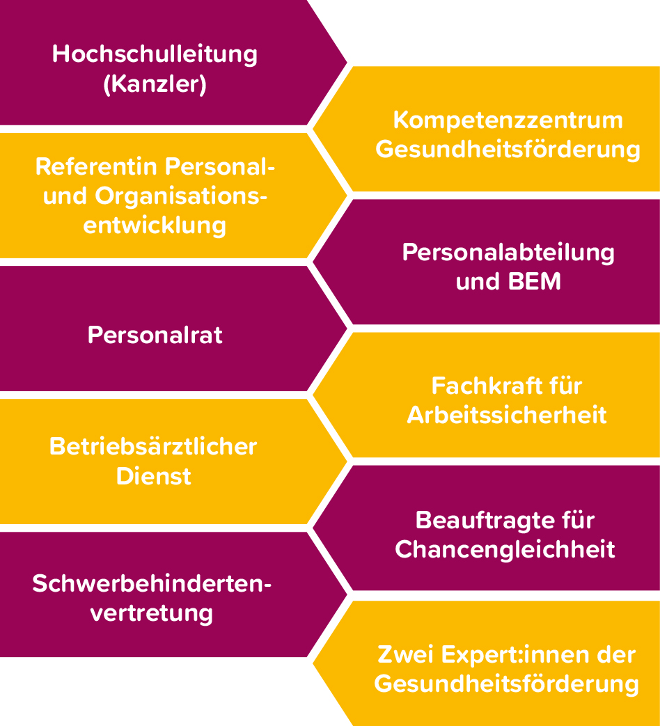 Der Steuerungskreis „Gesunde Hochschule“ setzt sich aus Akteuren zusammen, die gesundheitsbezogene Aufgaben haben und aus verschiedenen Blickwinkeln durch ihre aktive Mitarbeit das BGM voranbringen (s. Grafik).