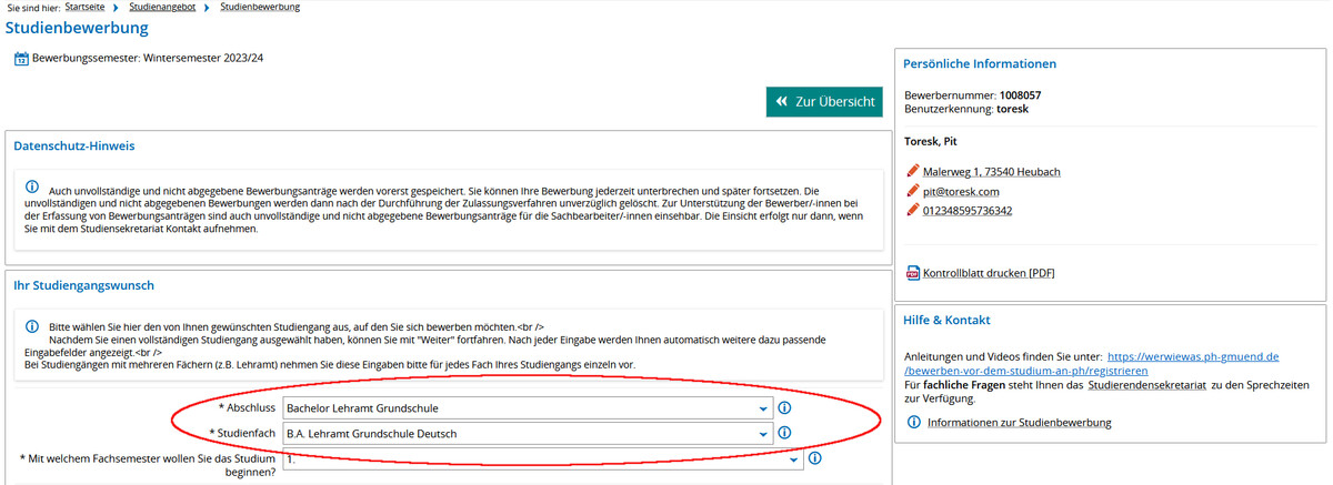 Hier finden Sie nochmal alle wichtige Daten zusammengefasst. Rechts Ihre Kontaktdaten und wo Sie bei Fragen Hilfe finden. Links die Übersicht über Ihr bereits abgegebenen Bewerungsanträge. Und unten den Button Bewerbungsantrag hinzufügen, mit welchem Sie den Vorgang starten.