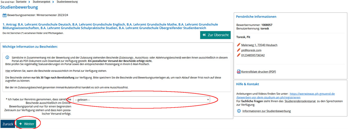 Hier bestätigen Sie die Kenntnisnahme, dass sämtliche Bescheide im Online-Bewerbungsportal zur Verfügung stehen und dies auch nur für eine begrenzte Zeit.