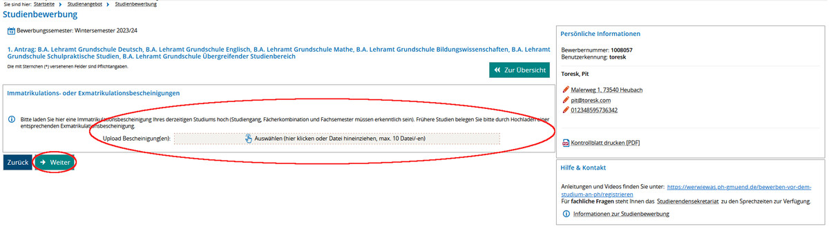 Bitte beachten Sie: Dies zeigt eine beispielhafte Bewerbung. Abhängig davon, für welchen Studiengang Sie sich bewerben, kann es Abweichungen geben.