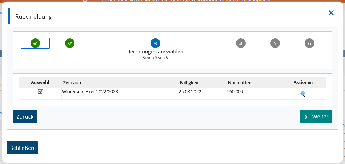 Über Studienservice finden Sie oben links den Button Rückmelden. Dieser erscheint während der Rückmeldephase.