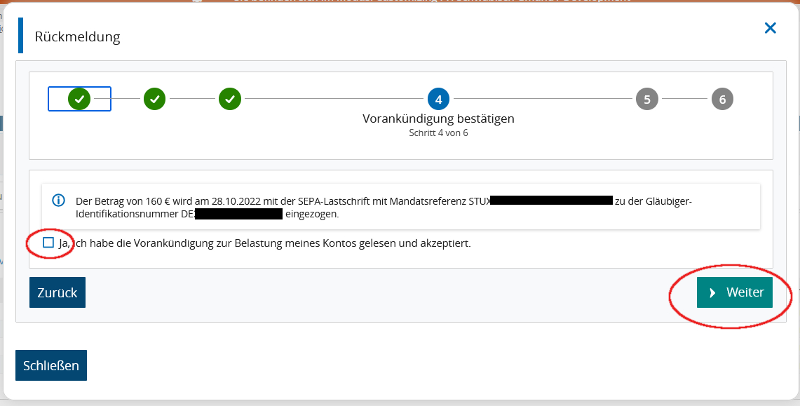Es öffnet sich ein Dialog-Fenster. Anhand des Zeitstrahls sehen Sie, in welchem Teilschritt der Bearbeitung Sie sich gerade befinden. Über den rot eingekreisten Button Bezahlen können Sie starten.