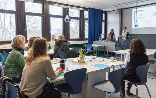 In sechs Sitzungen gingen im Kurs „Stress we can!“ jeweils zwei Studierende den Fragen nach: Wie entsteht Stress? Warum ist Stress eigentlich nichts Schlimmes? Welche Reaktionen ruft Stress hervor? Mit welchen Kompetenzen kann man Stress bewältigen? „Ziel des Programms war es, den Mitarbeitenden ein Repertoire an Möglichkeiten zur aktiven und individuellen Stressbewältigung im Arbeitsalltag mit an die Hand zu geben“, so die Studierenden Lukas Rein und Colleen Schwartz. Dafür vermittelten sie zunächst Grundlagen, um Stressbelastungen zu erkennen und zu verstehen. Daran anknüpfend zeigten sie Wege auf, wie Stressoren abgebaut, persönliche stressverschärfende Denkmuster entschärft und Stressreaktionen durch Erholung und Entspannung reduziert werden können.
