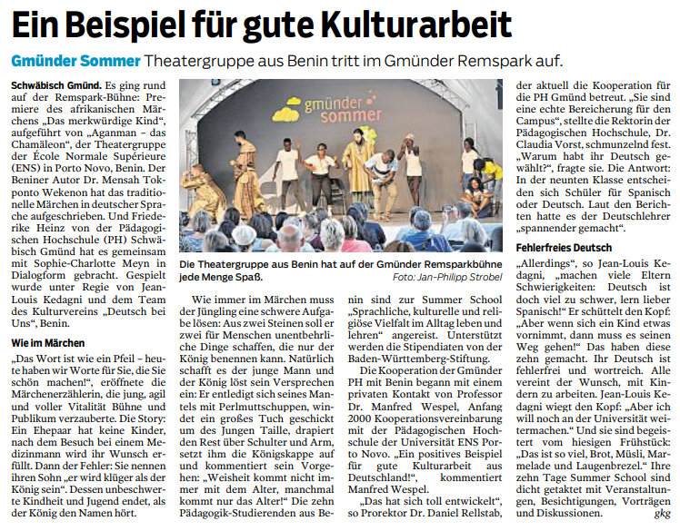 Ein besonderes Highlight war die von der VHS Schwäbisch Gmünd und dem Verein der Freunde der PH geförderte Theateraufführung der Studierenden der ENS auf der Remsparkbühne, die ein beninisches Märchen im interkulturellen Kontext erzählte.