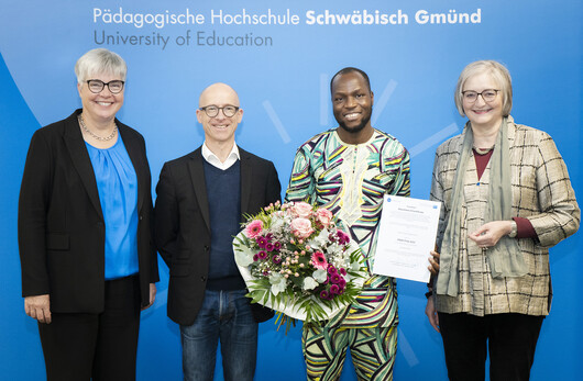 Koumbeou, der als Stipendiat der Hanns-Seidel-Stiftung an der Pädagogischen Hochschule Schwäbisch Gmünd den Masterstudiengang „Germanistik und Interlingualität / Multilingualität“ studiert, hat sich in den letzten Jahren nicht nur als aktiver Student in vielen Projekten erwiesen, sondern engagiert sich auch unverändert für sein Heimatland Benin und stärkt die Brücken zwischen den Ländern. So hat er beispielsweise seine in Deutschland erworbenen Kenntnisse in die Ausbildung der Deutschlehrkräfte in Benin eingebracht, indem er eine Fortbildung zu digitalen Medien im Deutschunterricht angeboten hat. Neben dem Studium hat er die NGO „Association Tamawè Espoir“ gegründet, die Kinder in herausfordernden Lagen mit Schulmaterial ausstattet. „Herr Koumbeou ist ein Mittler zwischen Deutschland und Benin“, unterstrich Prorektor Prof. Dr. Daniel Rellstab. „Es ist inspirierend zu sehen, mit welcher Kraft und Leidenschaft er sich einbringt.“ Koumbeou nahm den Preis mit großer Rührung entgegen und dankte den vielen Menschen, die ihn auf seinem Weg begleitet und unterstützt haben und dies immer noch tun.