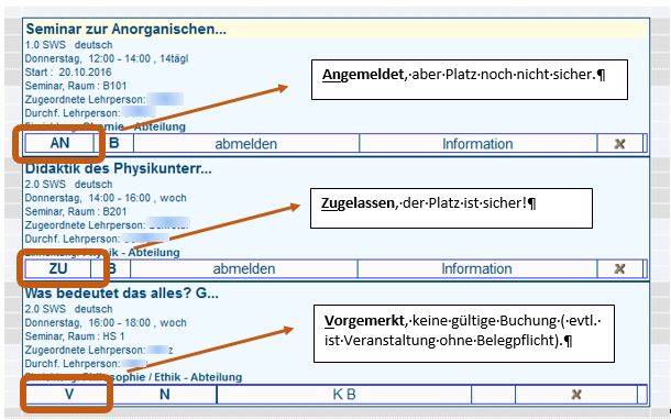 Wenn Sie Ihren Stundenplan (Meine Funktionen - Stundenplan) aufrufen, sehen Sie bei jeder Veranstaltung, welchen Status diese hat.